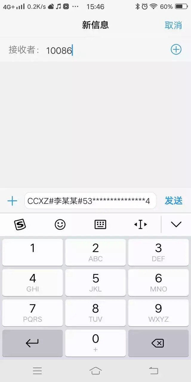 第一步:拿起你的手机通过短信在线查询携转资格(短信编辑CCXZ#用户名#证件号码,发送至归属运营商,移动10086,联通10010,电信10001)如图所示: