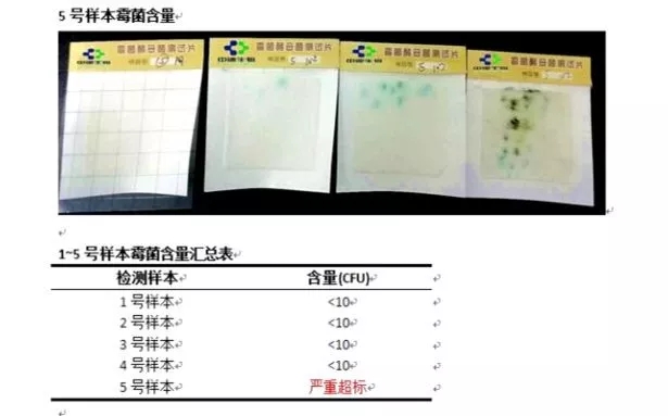 经计算,每克中含有约400个霉菌菌落。比起国家规定霉菌限量标准:每克不得超过25个霉菌菌落,5号样品的霉菌含量,整整超标了16倍!